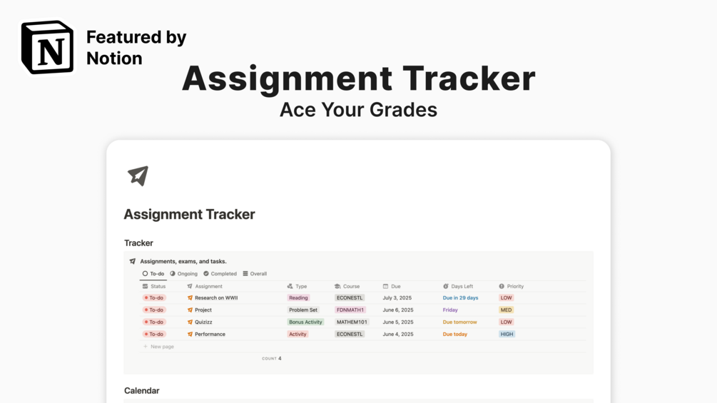 The Assignment Tracker is a simple but powerful Notion Featured academic task manager. Designed for straightforward, efficient students looking to save time and ace their grades.