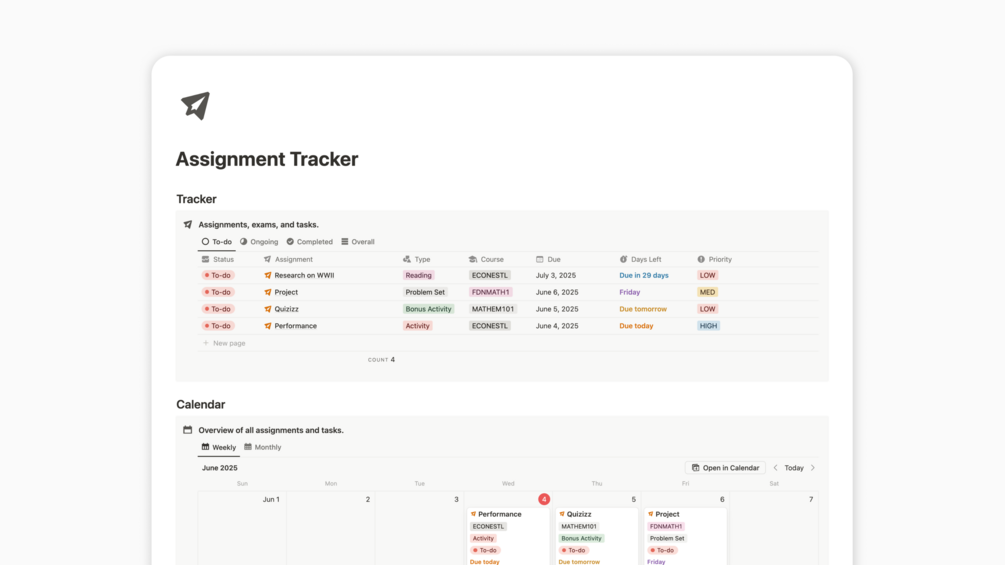 What makes this different from other templates?Assignment Tracker is minimal by design—just the essentials, no clutter. It’s fast, focused, and made to help you stay on top of assignments without the overwhelm. If you want a more complete system with a free scheduler wallpaper, check out Student Life OS.