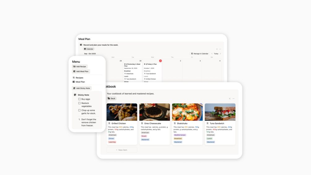 The Cookbook Planner is a simple and easy way to actually start planning your meals and building a second brain of recipes. With Cookbook Planner, you can add recipes and indicate your mastery of them, and then add them to your daily meal plans. You can also track calories!