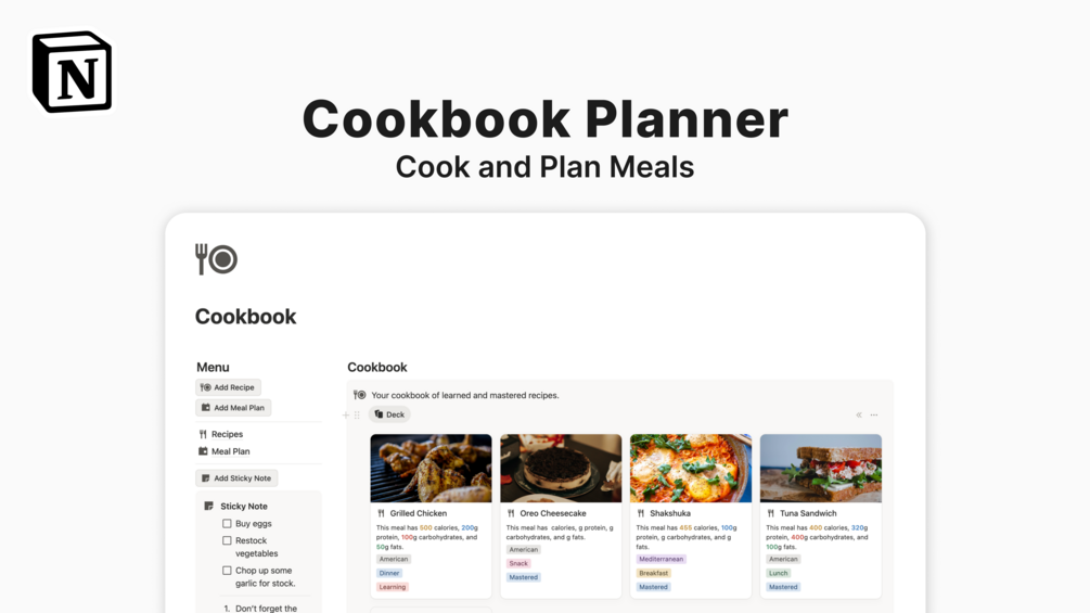 The Cookbook Planner is a simple and easy-to-use Notion template that helps you manage your recipes and plan your meals.