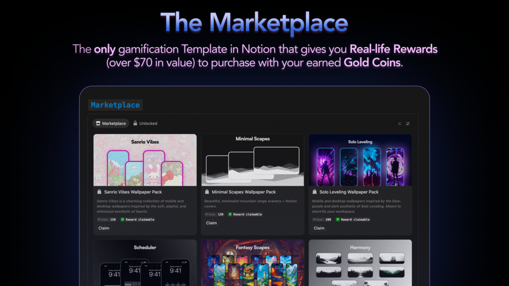 Spend EXP on real-life rewards like exclusive 4K HD wallpaper packs and Notion templates