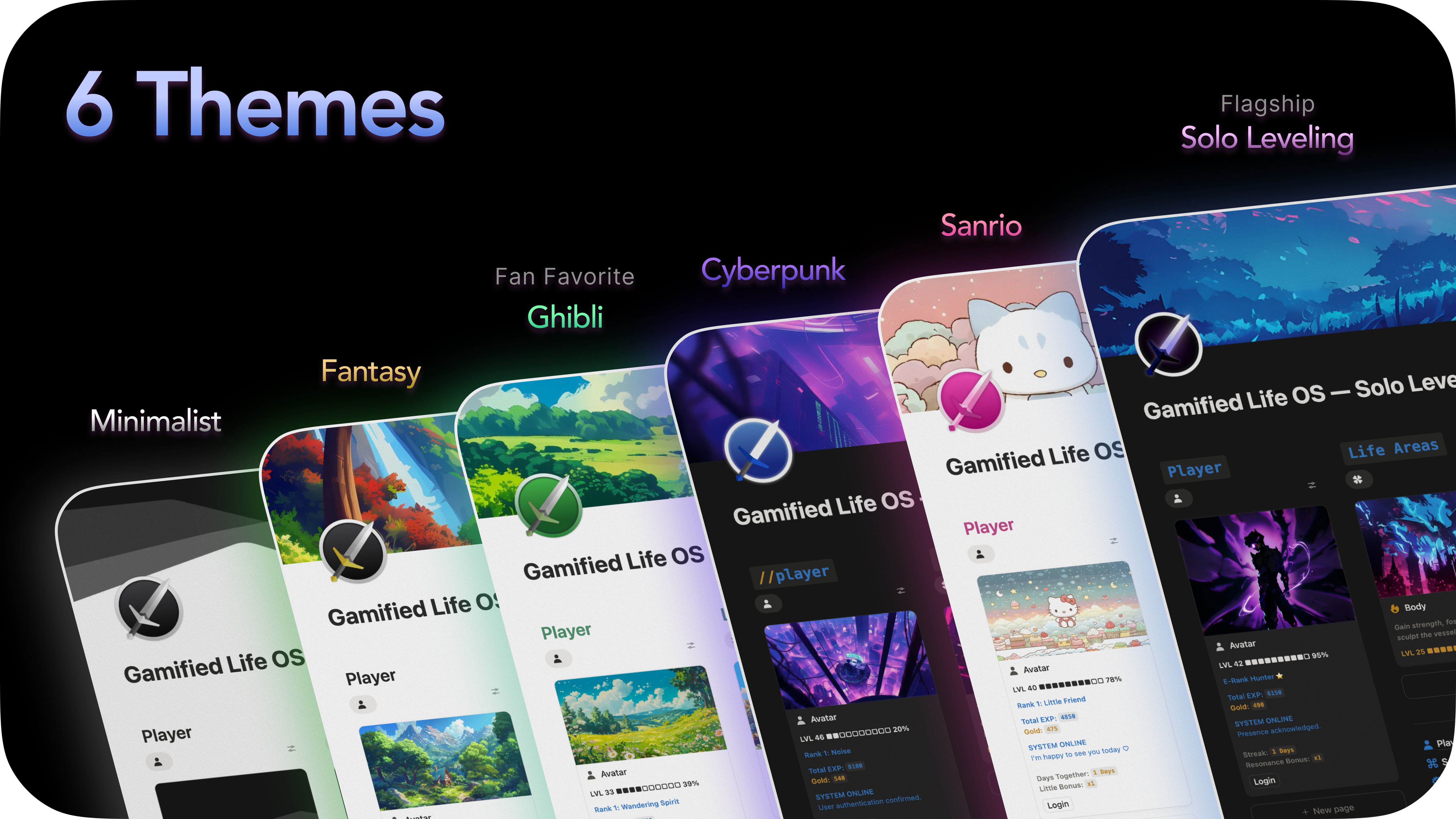 6 beautiful themes: Minimalist, Ghibli, Fantasy, Sanrio, Cyberpunk, and Solo Leveling.