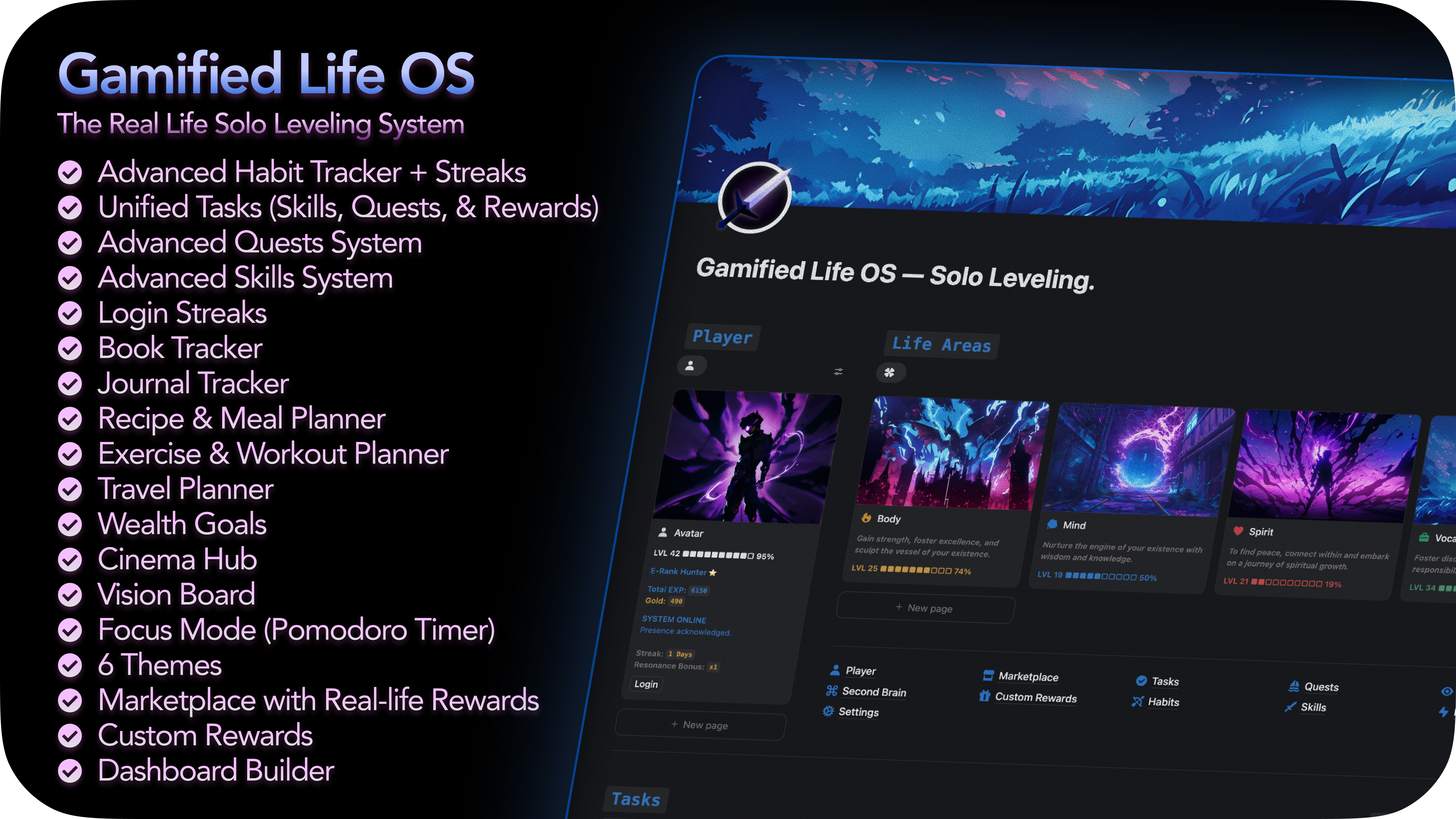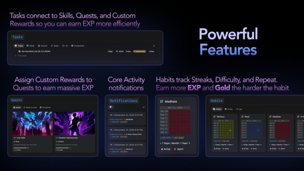 Just a powerful, modular system that lets you focus on core actions: Tasks, Habits, Quests, and Skills, while naturally improving the rest of your life (reading, workouts, journaling, cooking, savings, and more).