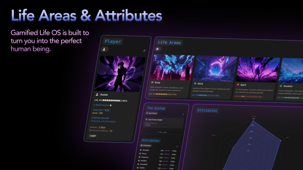 Every task you complete, habit you maintain, and goal you achieve earns you EXP and levels you up across four core life areas: