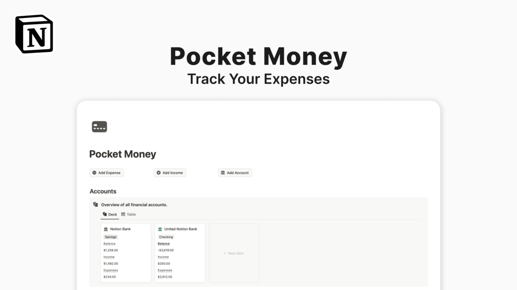The Pocket Money Notion template is a simple and easy-to-use expense tracker that is optimized for both desktop mobile devices. You can easily track your daily expenses, income, and accounts by tapping the button-based dashboard.