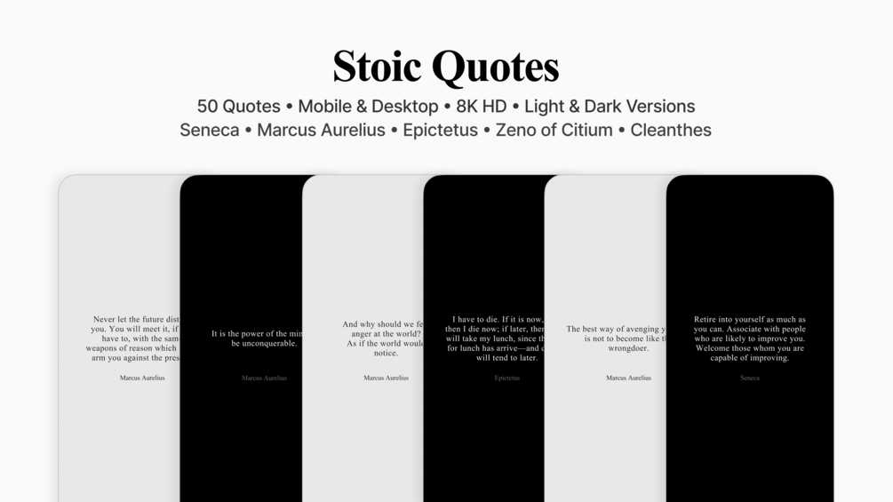 Stoic Wisdom is a powerful and simplistic 10K HD wallpaper collection of over 50 quotes from the most famous stoic philosophers in history. The premium pack includes light and dark, as well as desktop and mobile versions of powerful, specially curated stoic quotes. The pack also comes with an additional 6 sets (12 wallpapers) of 8K HD Ancient Greek sculptures that represent stoic values.