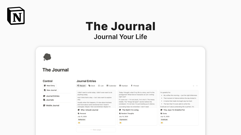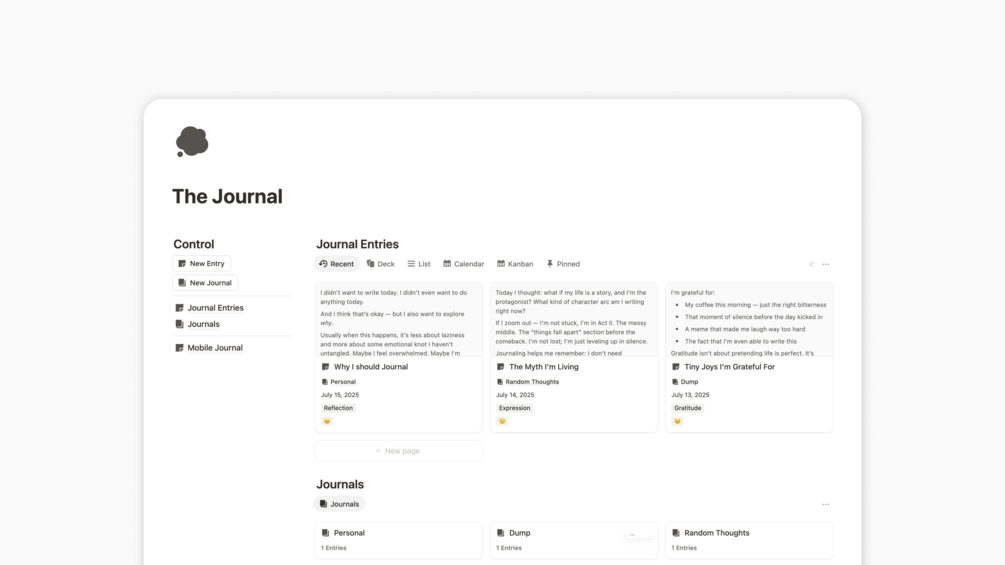 The Journal is a simple and easy way to journal everything about your life, from reflections, gratitude, dreams, and even memories. The Journal Notion template allows you to do this easily, without fuss, and all for free.
