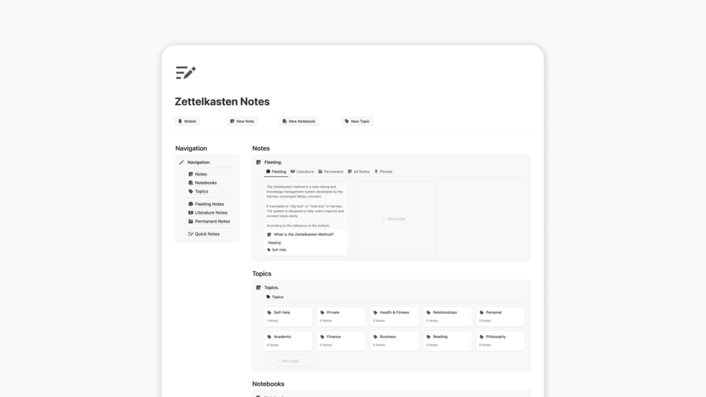 - Notes: A super simple note-taking system that lets you take Fleeting Notes and turn them into Literature, Permanent, and Reference Notes.